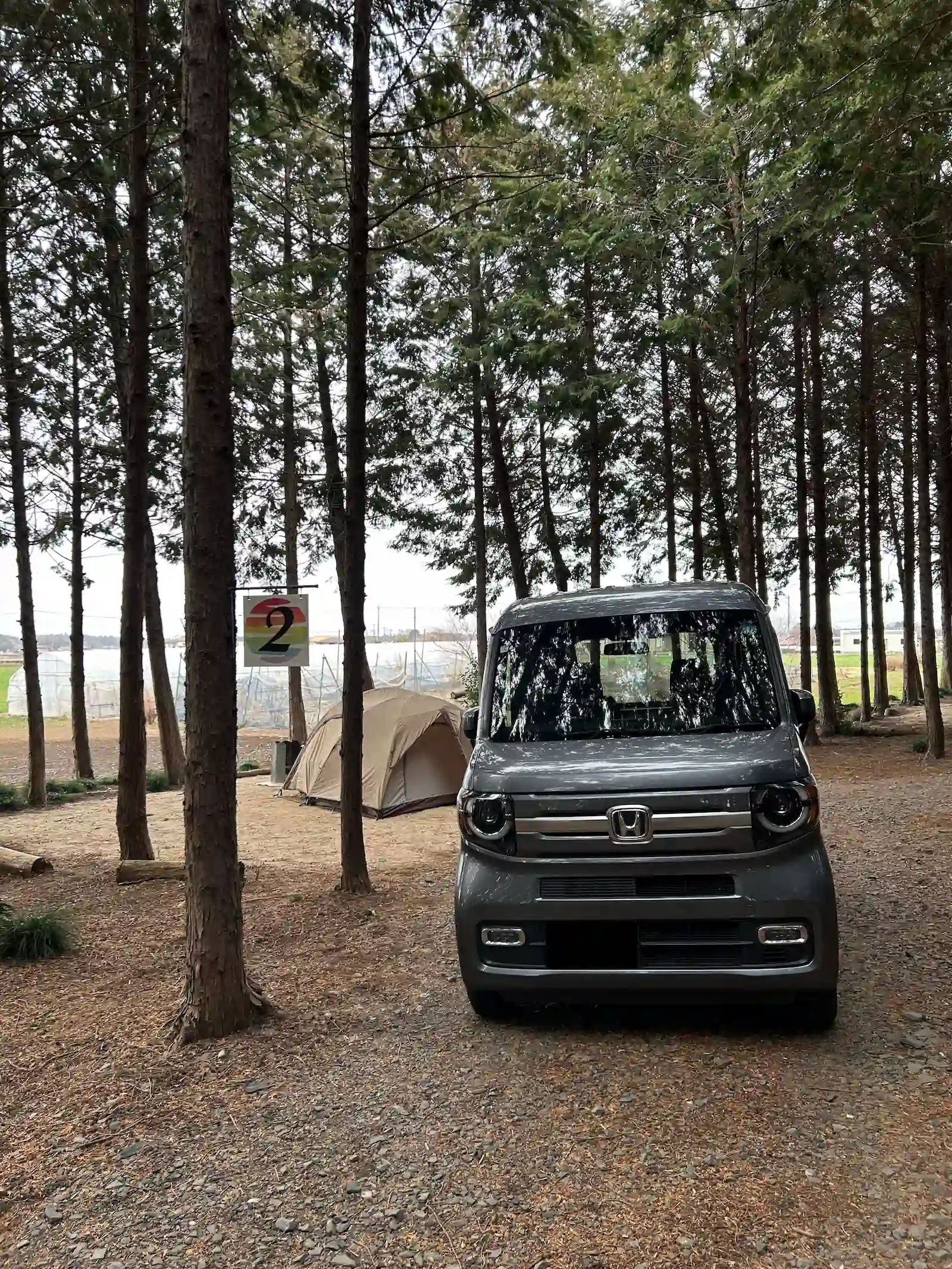 区画内に車を横付けできますが、駐車スペースは砂利で、No.2サイトの駐車スペースでは車中泊は厳しく感じる傾斜感がありました。
